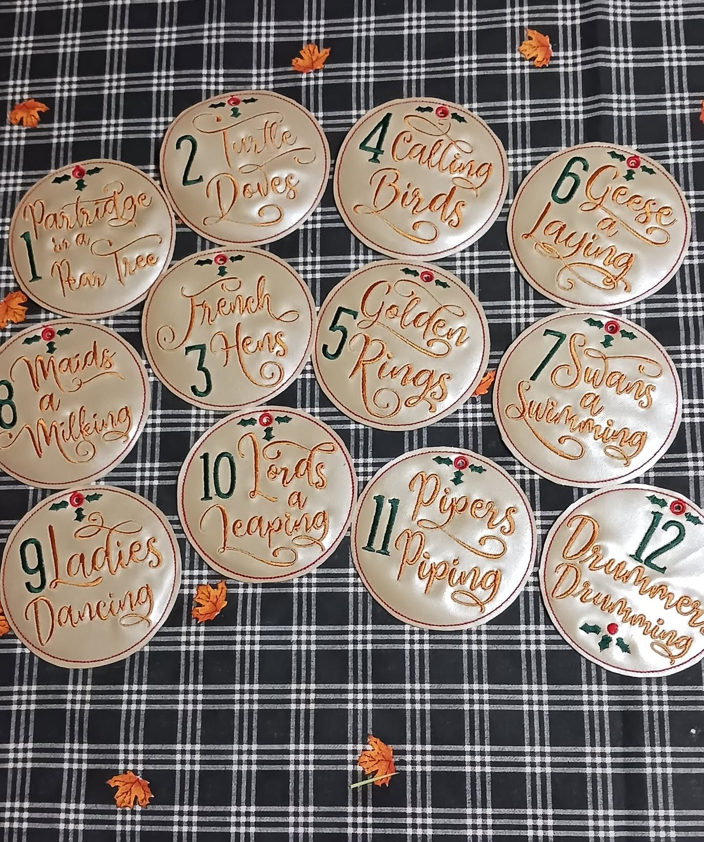 Sorry, I haven't been able to try them yet. Looking forward to sewing them out soon, though. Thanks for the cute designs of the "12Days of Xmas" . I want to make indivual badges , to wear each day of the 12 days. Thanks again, Jody