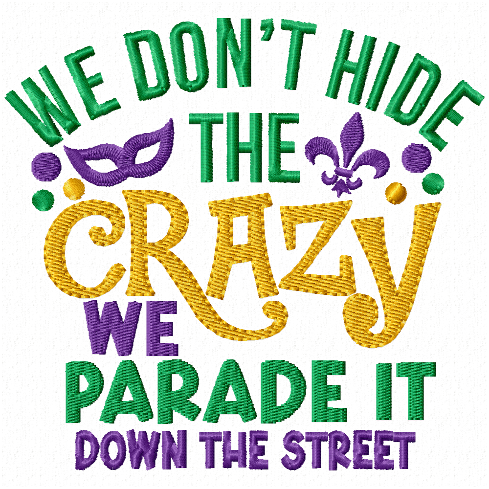 I put this on a shirt for my grand’s mother. She lives for Mardi Gras and loves all of the crazy (fun) activities. She loved this shirt and wants one in all the Mardi Gras colors!