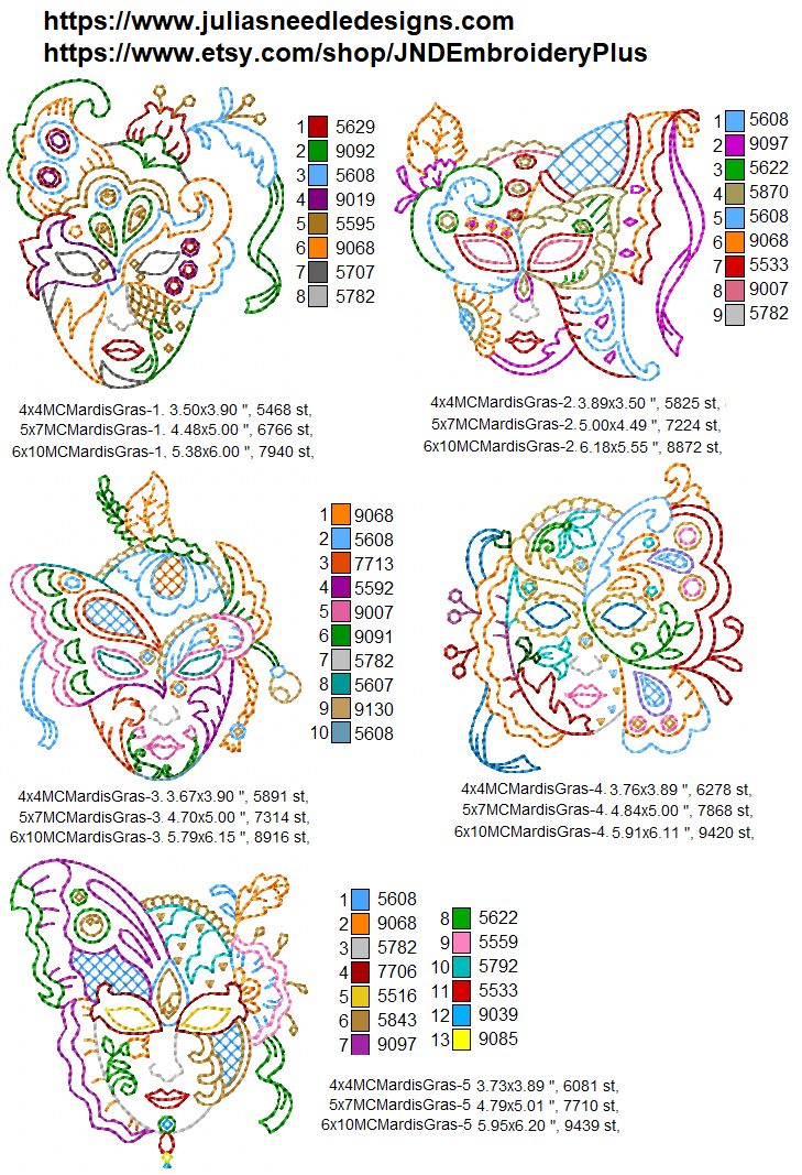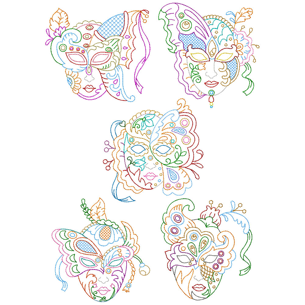 Gorgeous set of five colorful masks just in time and perfect for Mardi Gras.