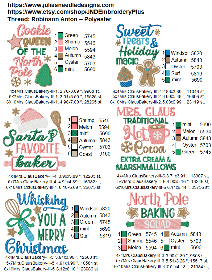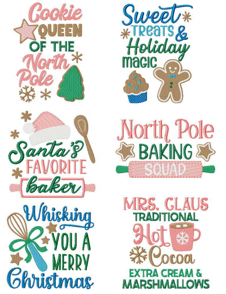 Set of six Mrs. Claus Christmas baking themed designs. Perfect for the holidays.
