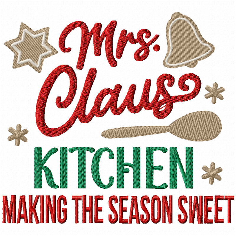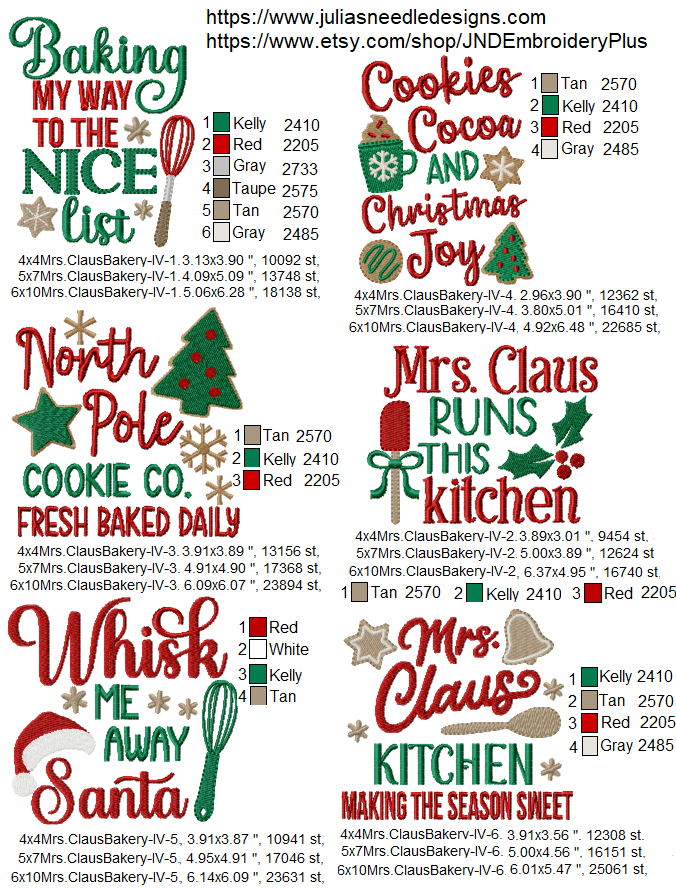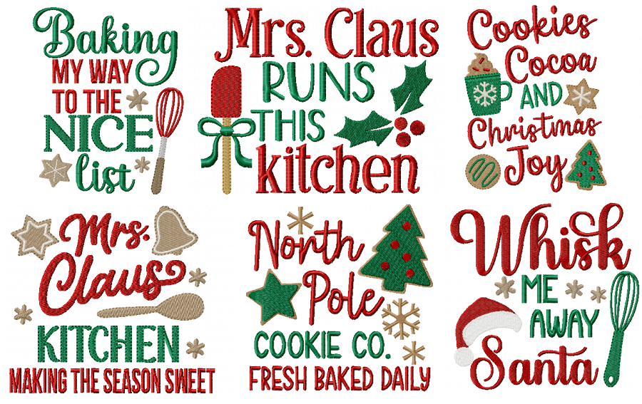 Set of six Mrs. Claus Christmas baking themed designs. Perfect for the holidays.