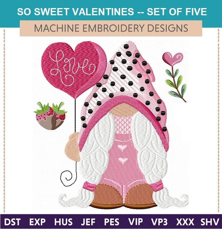 Set of five designs representing sweet Valentine's day. Not all designs are available in 5x7 so be sure to check the color charts before ordering.