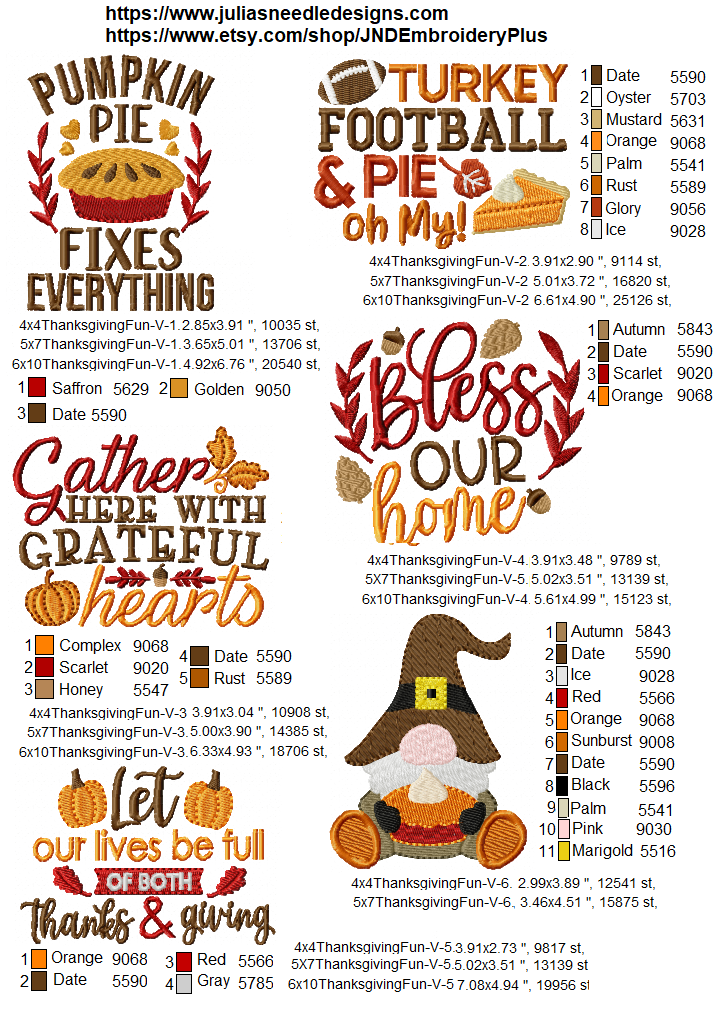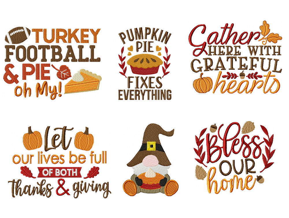 Set of six fun Thanksgiving themed designs. Wonderful sayings perfect for Thanksgiving.